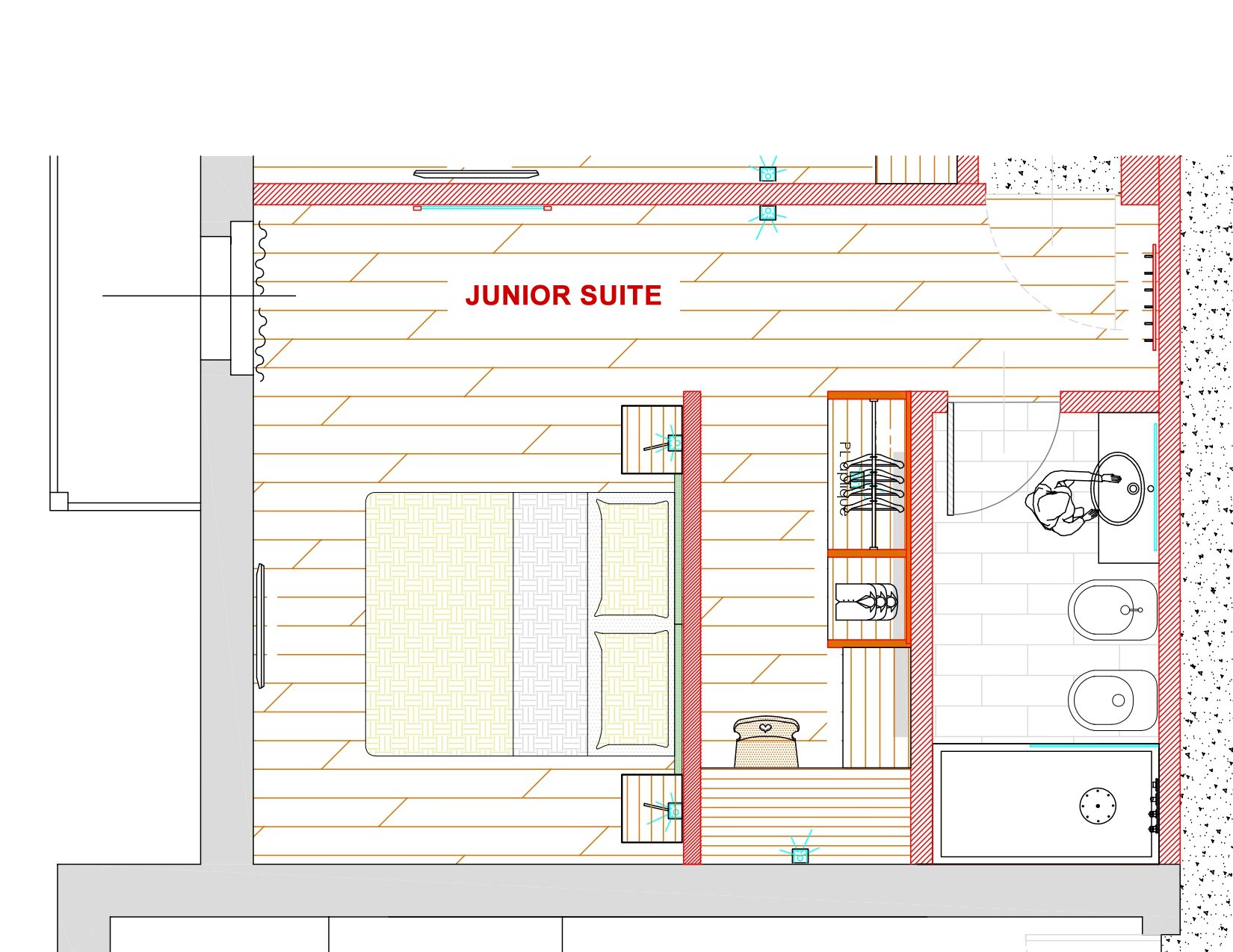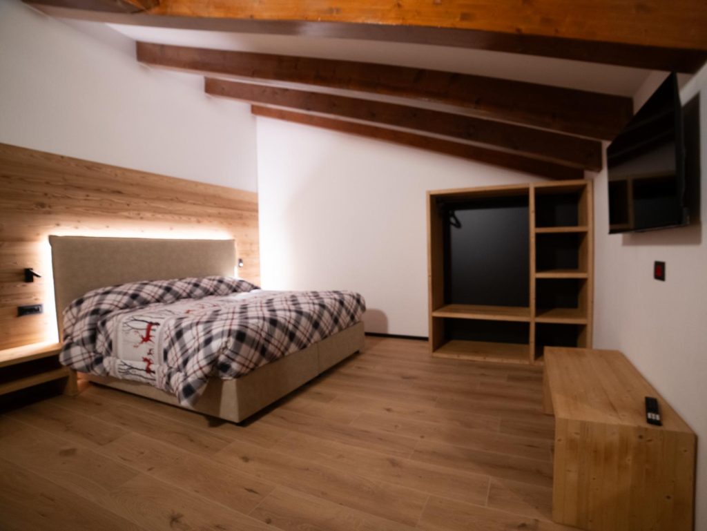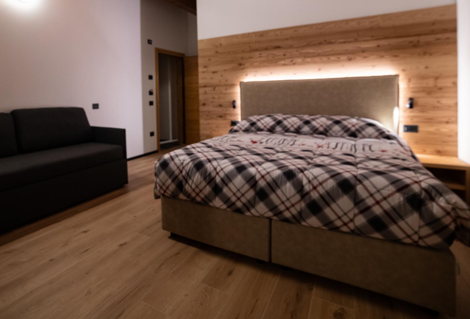 Camera ampia e luminosa con letto matrimoniale, tutte con divano letto o letto a castello, adatte a chi ama gli spazi come le famiglie. Tutte hanno il balcone, moquette, la maggior parte con vista sul Castello di Ossana.